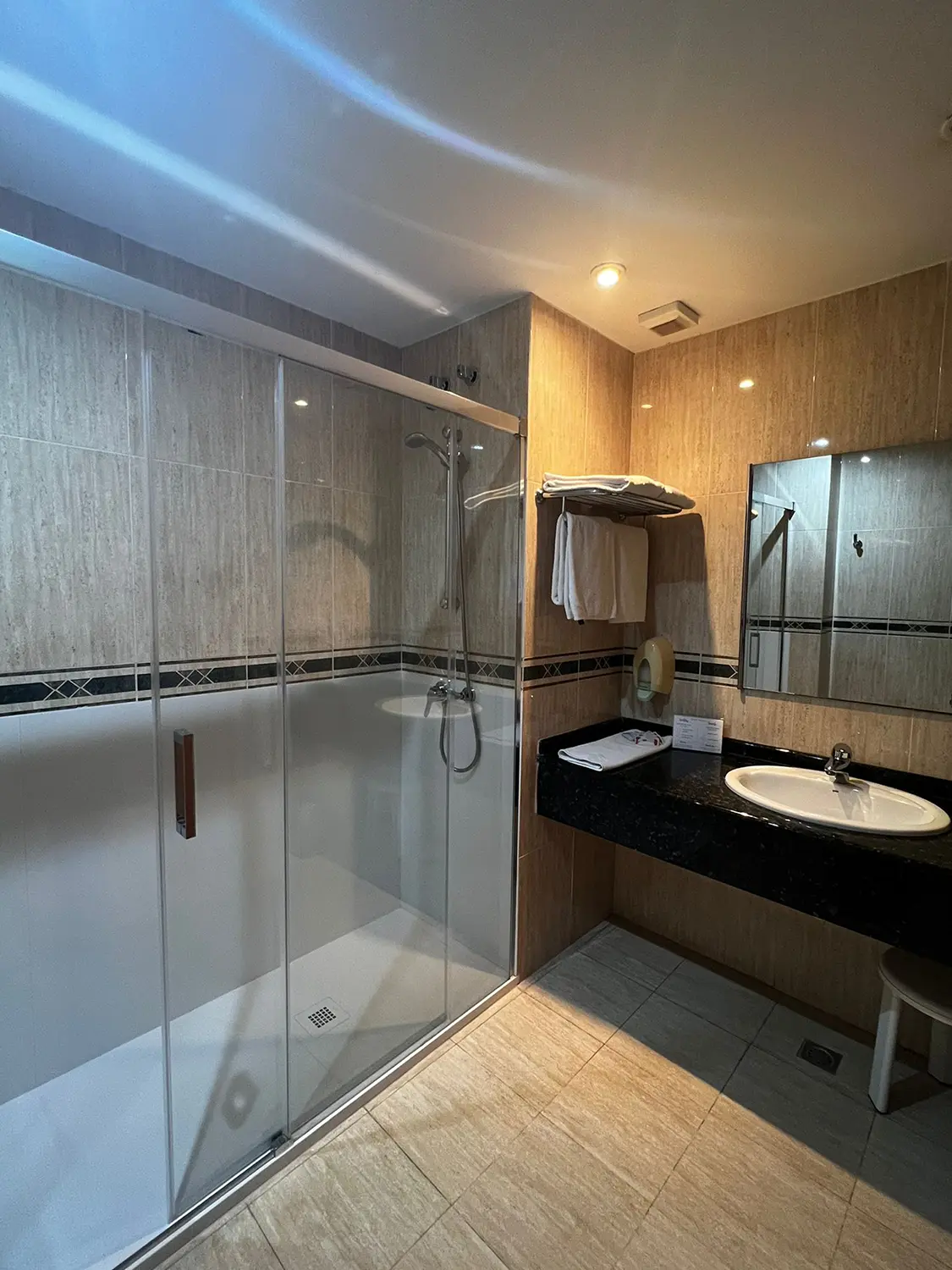 Habitación para 3 personas cuenta normalmente con 3 camas individuales dispone de aire acondicionado, escritorio, nevera pequeña con agua de bienvenida, 2 sillones y mesita, TV, baño privado con bañera o ducha. Habitación amplia y luminosa.